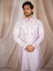A lilac satin raw silk kurta featuring tropical embroidered motifs—flamingos, palm trees, and pineapples. Soft on the skin with a gentle sheen, this piece brings playful coastal elegance to festive dressing.